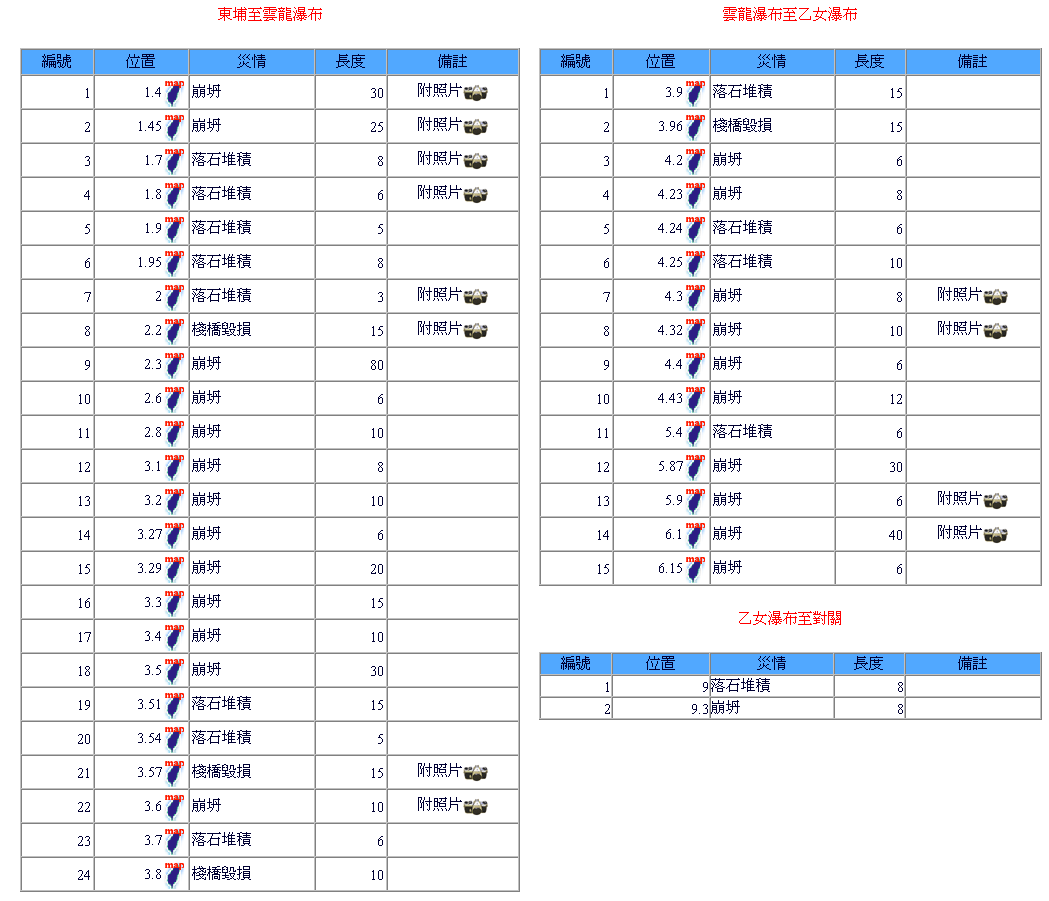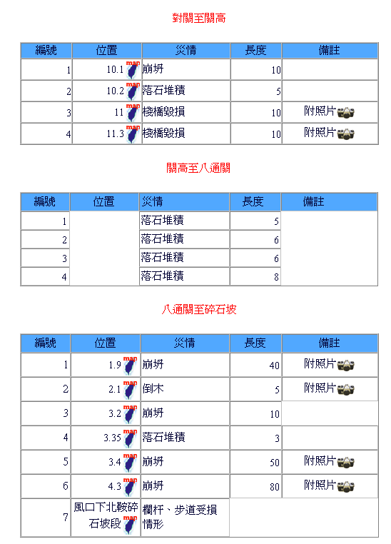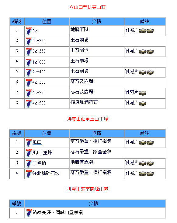 南部園區除經中之關及庫哈諾辛山步道有小型坍方外,其離震央較遠災害較輕微。